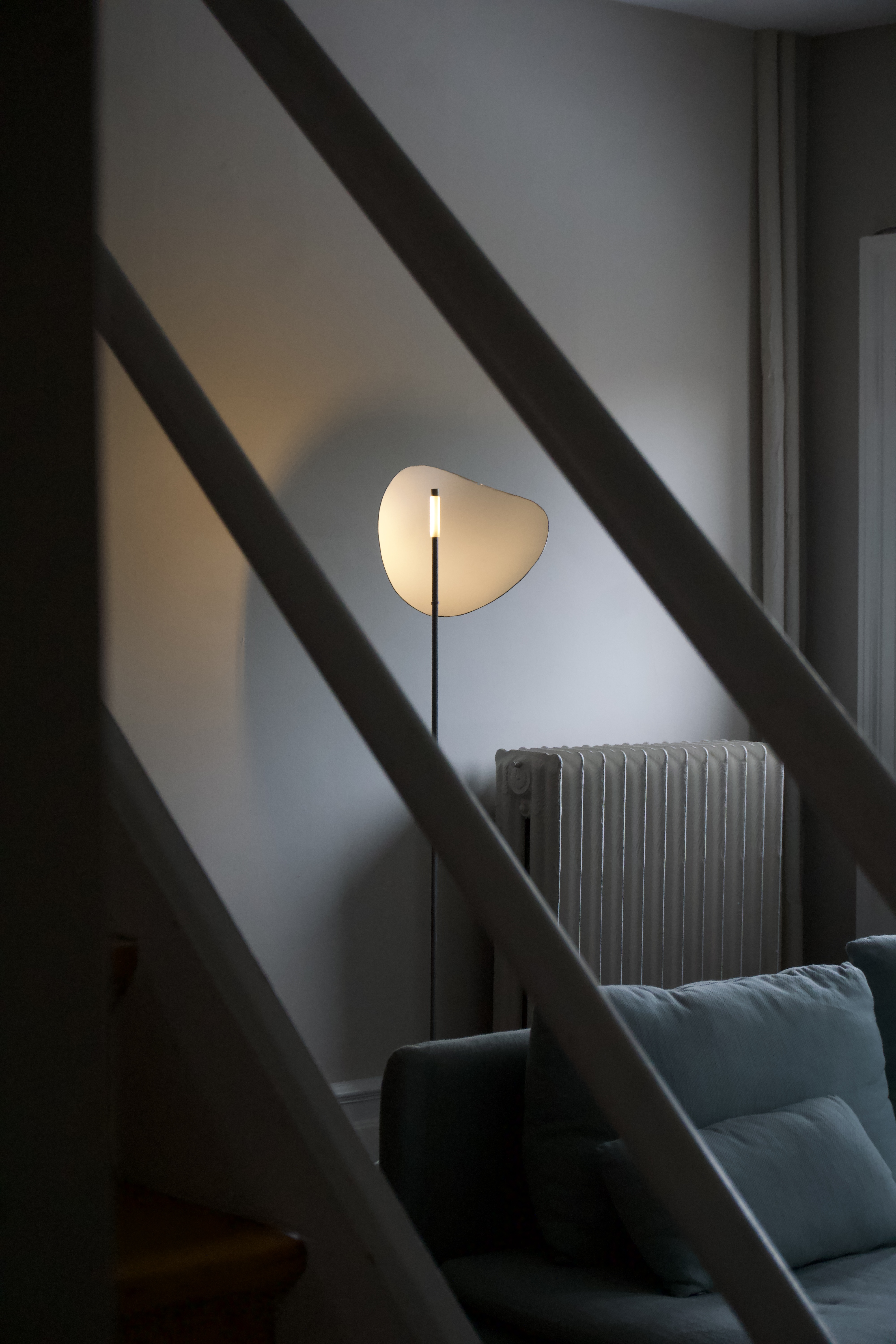 The petal lamp captures a delicate moment; when a wilted petal slowly retracts from the main body of the flower. The temporary nature of the action is preserved in time with paper and steel. Repositioning of the petal shaped shade grants authority over the type of light cast, allowing the user to dictate the behaviour of the light. The petal acts as a bounce similar to that of a photographer’s toolkit. Gentle sweeping shadows paint the surrounding space with arrays of ambient, gentle light. The delicacy of the fixture makes it well suited for domestic and residential evironments.